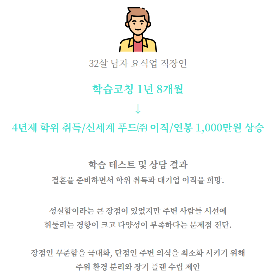 자신만의 장점으로 성공하기 성실함이 최고의 무기인 저희 고객님은 자신에게 맞는 학습법을 제안했습니다. 오랜 시간 공부에 손을 놓고 있었지만 끝내 자신이 원하는 자격요건을 갖춰서 텔레