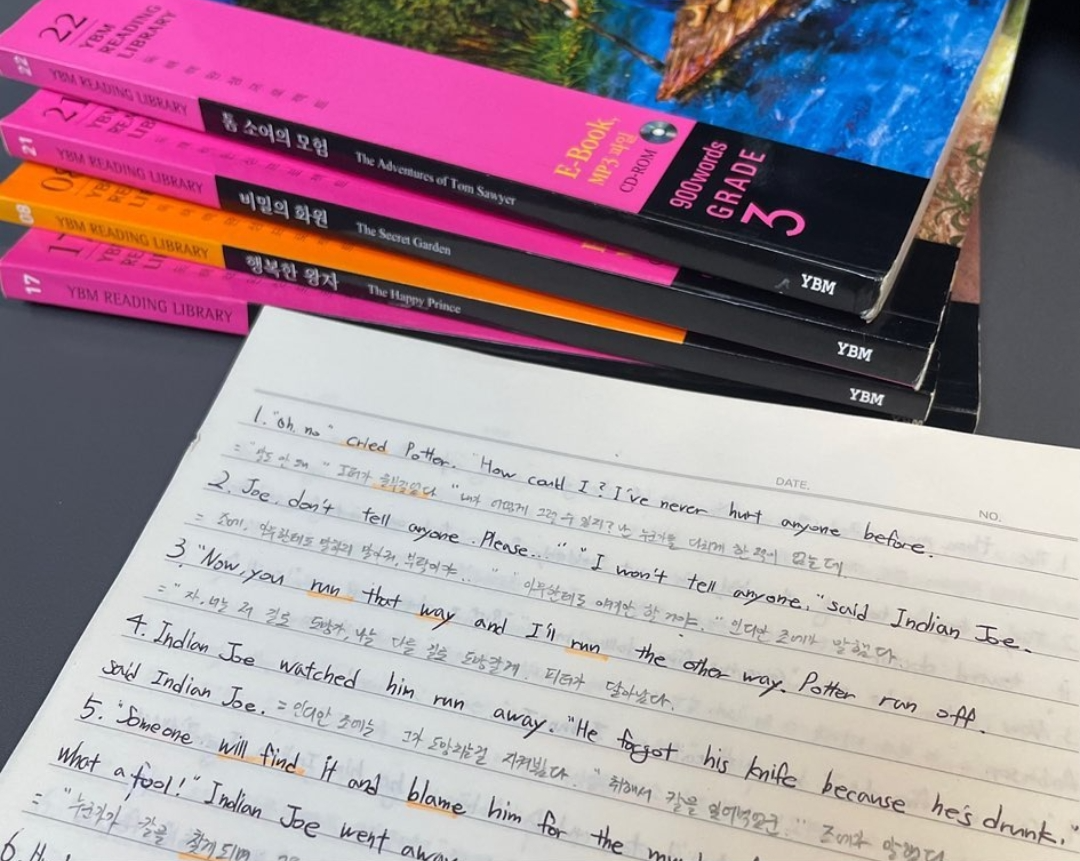 고객님이 독해를 문법처럼 완벽하게 파고 들어서 해석하려는 경향을 보이고 계셨어요. 그렇다 보니 독해보다 문법을 찾는 데 시간을 많이 쓰게 되셨죠. 그래서 본인이 잘 아는 소설이나 동화를 원서로 사서 매일 쓰면서 독해해보시라고 미션을 드렸어요. 아침에 잠도 깨고 아는 내용이라 해석도 빨리 돼서 재미를 붙이셨죠.