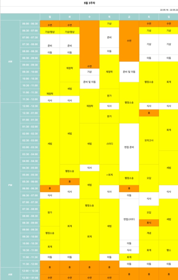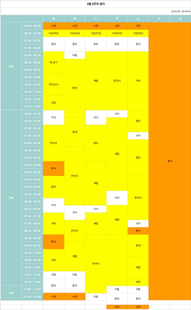 세무사 시험공부는 공무원 시험 준비를 끝내고 하는 게 낫다는 의견을 수렴하신 후 한국사, 영어, 국어 등 지방직 9급 공무원에 필요한 학습을 먼저 진행하며 시간표를 짜드렸습니다.