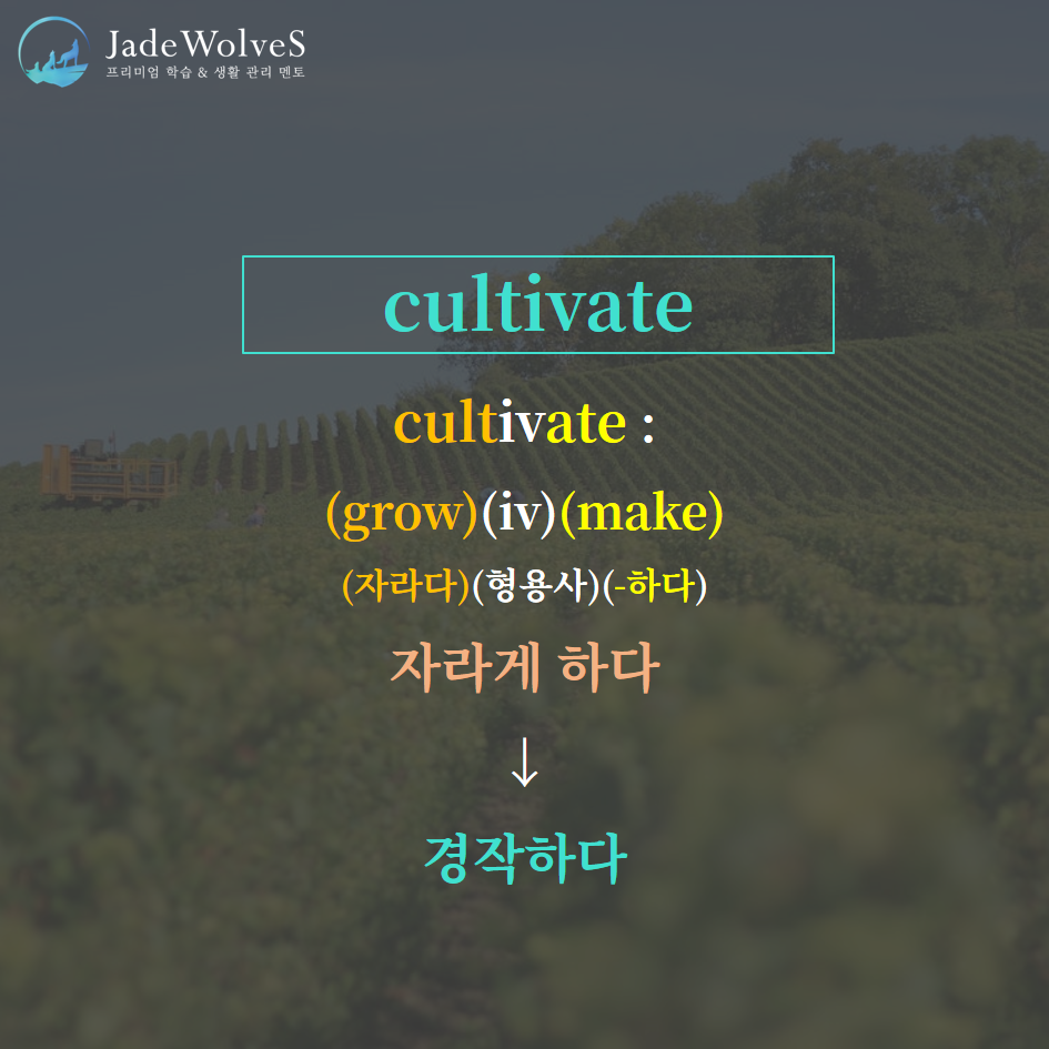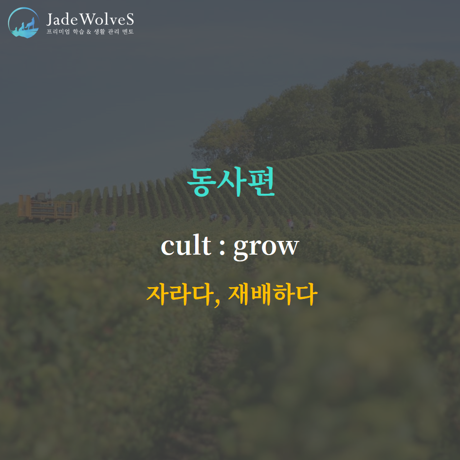 "cult : 자라다, 재배하다"라는 의미로 동사를 나타냅니다.