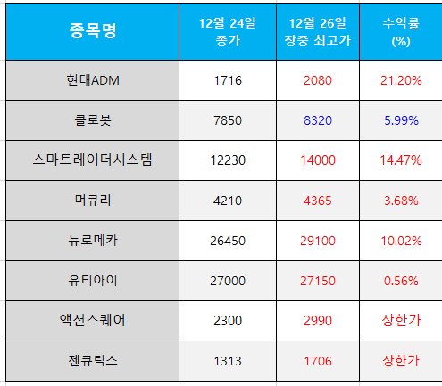 오늘의 관심 종목 수익률(2024.12.26)