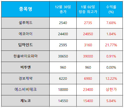 오늘의 관심 종목 수익률(2025.01.02)