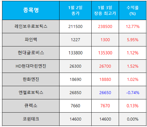 오늘의 관심 종목 수익률(2025.01.03)