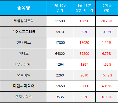 오늘의 관심 종목 수익률(2025.01.13)