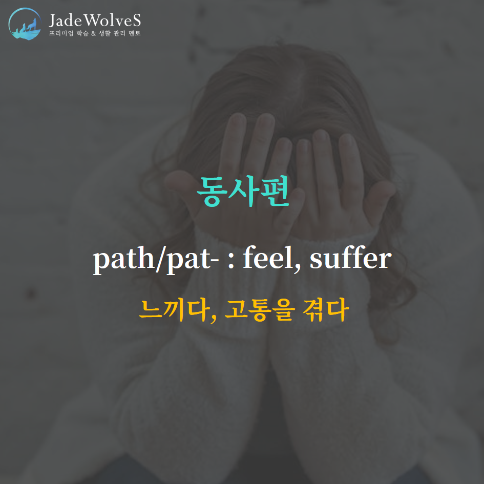 "path/pat- : feel, suffer"라는 어원으로 "느끼다, 고통을 겪다"라는 뜻의 동사를 나타냅니다.