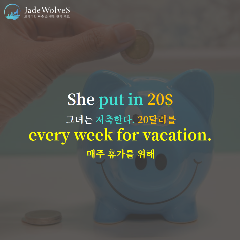 2) put by : "~에 넣다"라고 해서 "모으다, 저축하다"라는 의미로 사용됩니다.