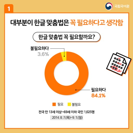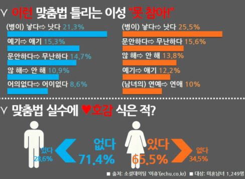 아래 표에서 보여주듯 한 소셜데이팅 서비스 업체가 '이성의 맞춤법 실수'를 주제로 미혼 남녀 1,249명에게 설문조사를 진행했다. 결과를 보면 맞춤법 실수로 호감이 식은 비율이 남성은 28.6%, 여성의 경우는 무려 반 이상인 65.5%에 달했다. 맞춤법이 틀리면 상대방은 이성적 호감도가 떨어진다는 것을 알 수 있다. 맞춤법 실수가 왜 이성에 대한 호감을 떨어뜨릴까? 맞춤법을 틀리는 것은 기본적 지식이 부족하다는 의미로 보인다. 기본적 지식이 부족한 사람은 결국 공부를 제대로 하지 않아 교양이 부족하다고 생각하기 마련이다. 그러니 이성에 호감을 잃지 않으려면 맞춤법에 신경 쓰자.