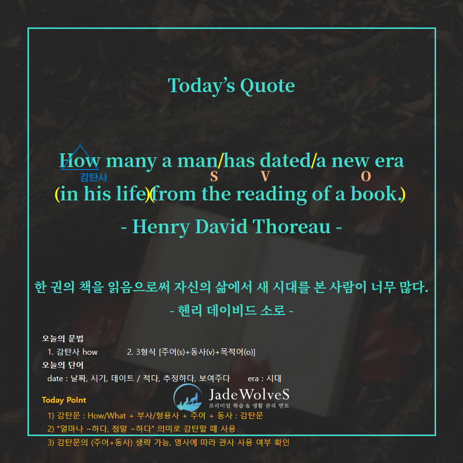 명언 한 구절 매일 외우고 연설가처럼 말해보자. 어느 순간 영어 회화가 술술 가능해질 수도 있다. 어려운 문법이나 단어를 억지로 외우도록 하면 금방 질려 버린다. 하루에 명언 하나씩만 외우고 명언을 쓴 인물처럼 말하다 보면 머릿속에서 문장 활용이 가능해진다. 언어는 기본문장을 배운 다음 그 문장을 응용할 수 있다. 그렇게 명언을 활용하면 자연스럽게 회화도 되기 시작한다.
