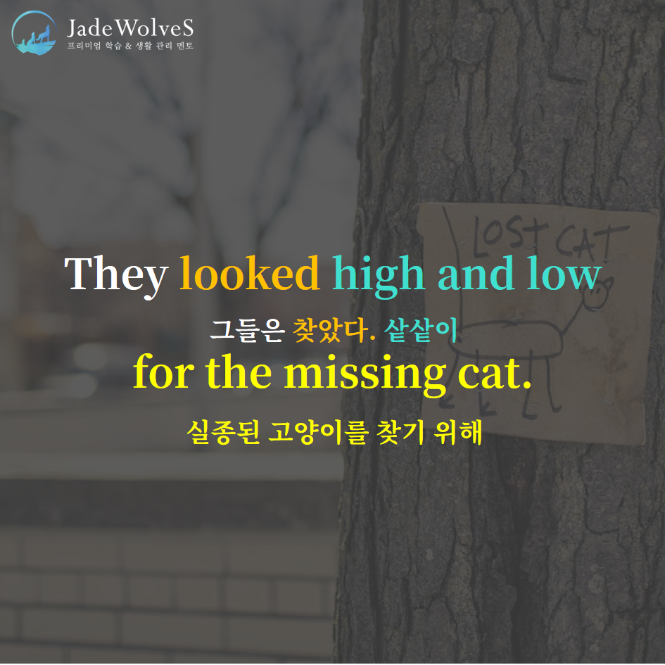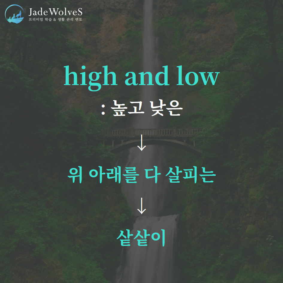 1) high and low : "위 아래로"라고 해서 "샅샅이"라는 의미로 사용됩니다.