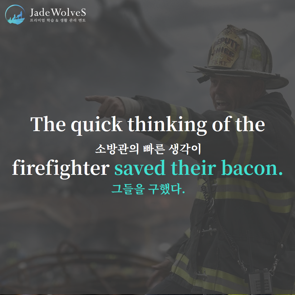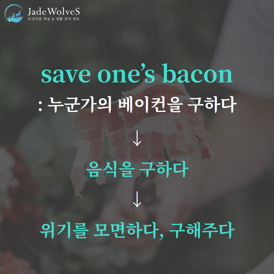 1) save one's bacon : "누군가의 베이컨을 구하다"라고 해서 "위기를 모면하다, 구해주다"라는 의미로 사용됩니다.