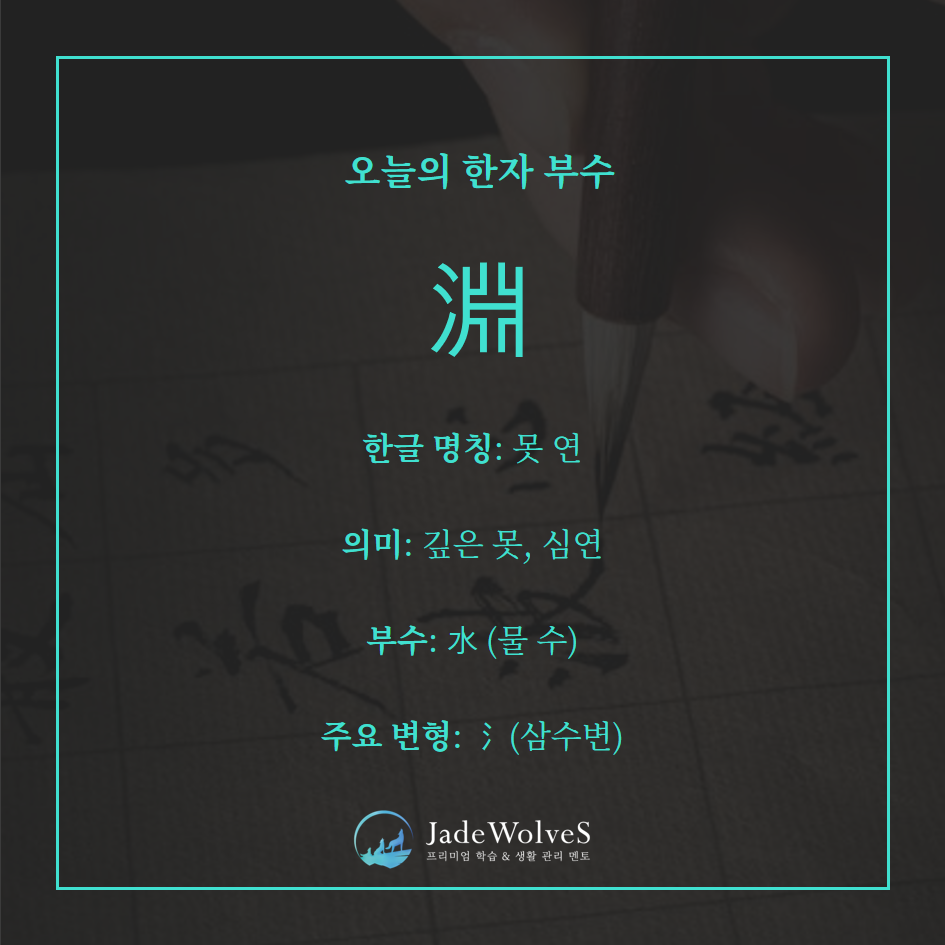 氵(물) 뜻부 + 㕣(연) 음부가 합쳐져서 물이 소용돌이치며 깊이 팬 곳을 가리켜 ‘깊은 못, 심연’을 뜻합니다.