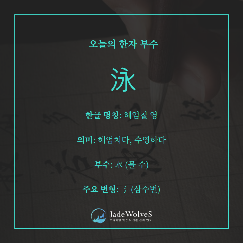 氵(물) 뜻부 + 永(길 영) 음부가 합쳐져 물에서 몸을 움직여 나아간다는 뜻에서 ‘헤엄치다’가 되었습니다.