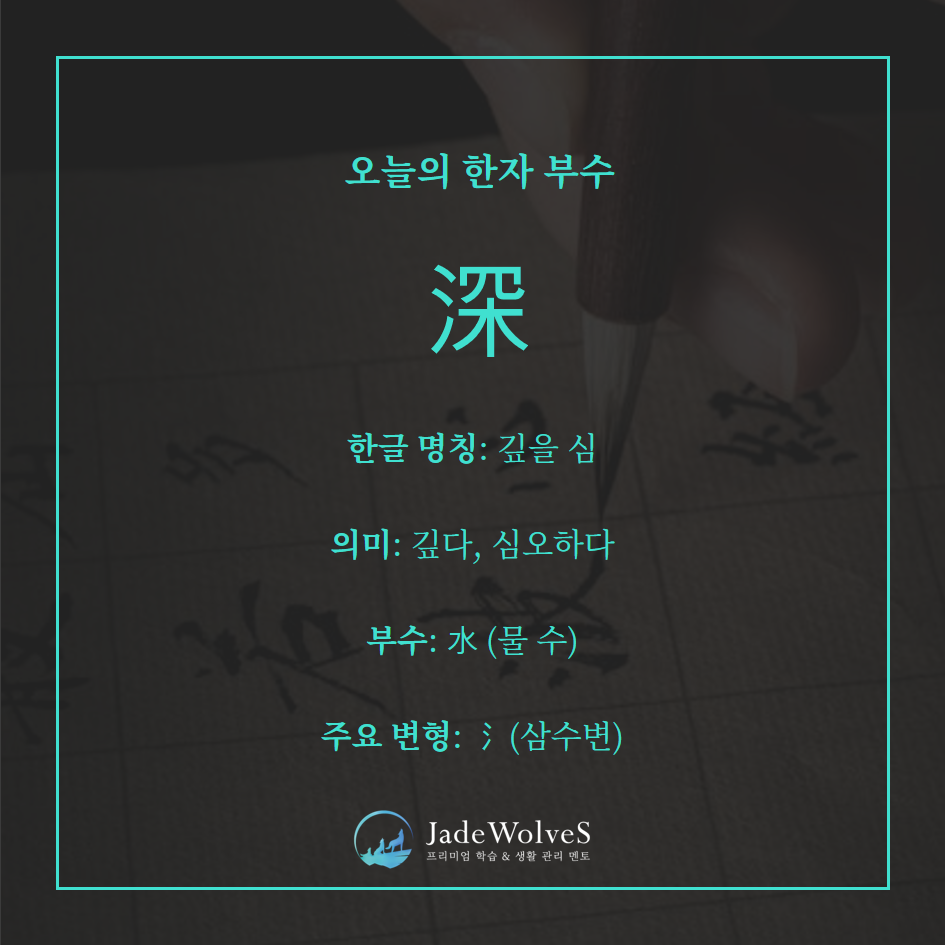 氵(물) 뜻부 + 罙(심) 음부가 합쳐져서 물이 깊어 바닥이 잘 보이지 않는 모습에서 ‘깊다, 심오하다’의 뜻이 낳았습니다.
