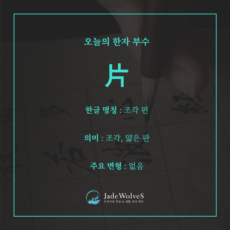 하나의 널빤지나 단면으로 작고 얇은 조각이라는 뜻으로 발전했다. 조각, 단면, 얇고 납작한 물건과 관련된 한자 분류에 사용 된다.