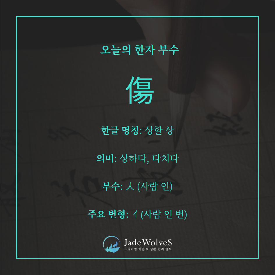 亻(인·사람/뜻부) + 尚(상·음부)인 형성자로 사람에게 생긴 해로움에서 ‘다치다, 상처’의 뜻이 납니다.