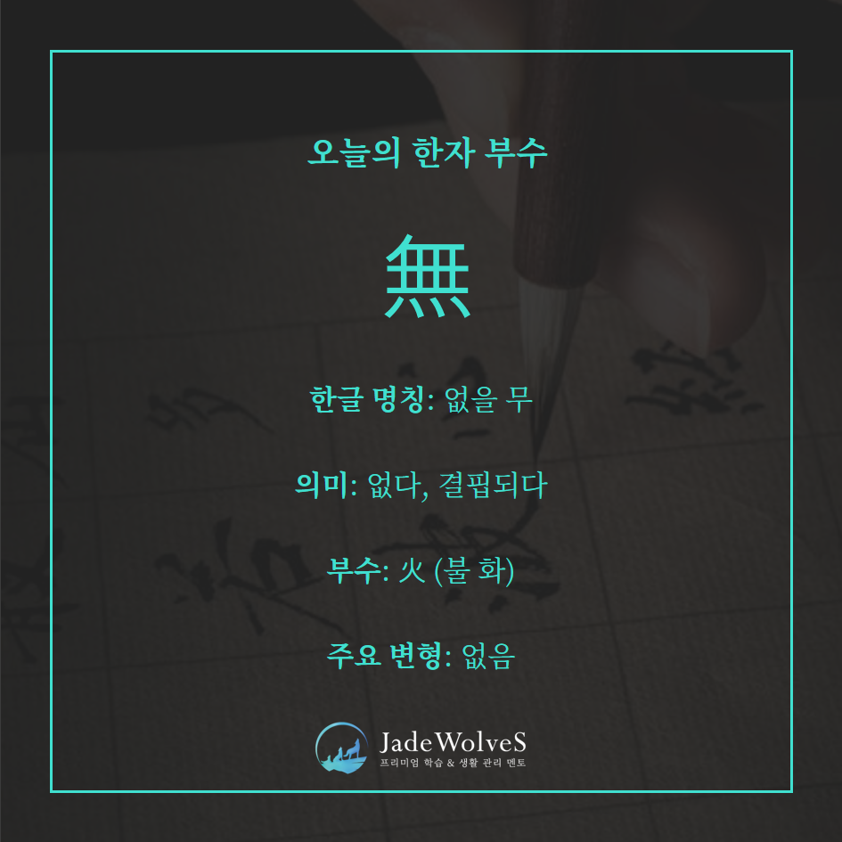 본래는 깃털을 흔들며 춤추는 사람의 모양을 그린 글자였으나, 차용되어 ‘없다’의 뜻으로 굳었습니다.