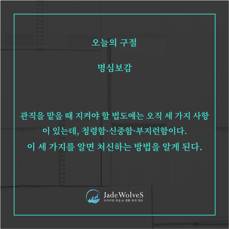 나라를 위해 일하는 사람에게는 도덕적인 잣대가 날카롭게 세워지기 마련입니다. 명심보감의 한 구절처럼 관직을 맡을 때 세 가지 사항을 현 시대의 정치인들도 마음에 새길 필요가 있습니다.