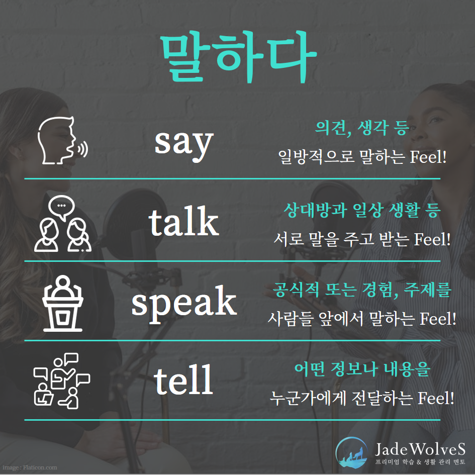 청랑 영어 식견/청랑 영어 단어 청랑의 보카 뉘앙스 : say/talk/speak/tell JWS 2024. 6. 14. 20:00 오늘은 '말하다'라는 뜻의 뉘앙스에 대해 알아보겠습니다. "say/talk/speak/tell는 말하다"라는 의미가 있지만 미묘한 차이가 있습니다.위 단어를 이용해 문장을 하나씩 만들어 보세요!