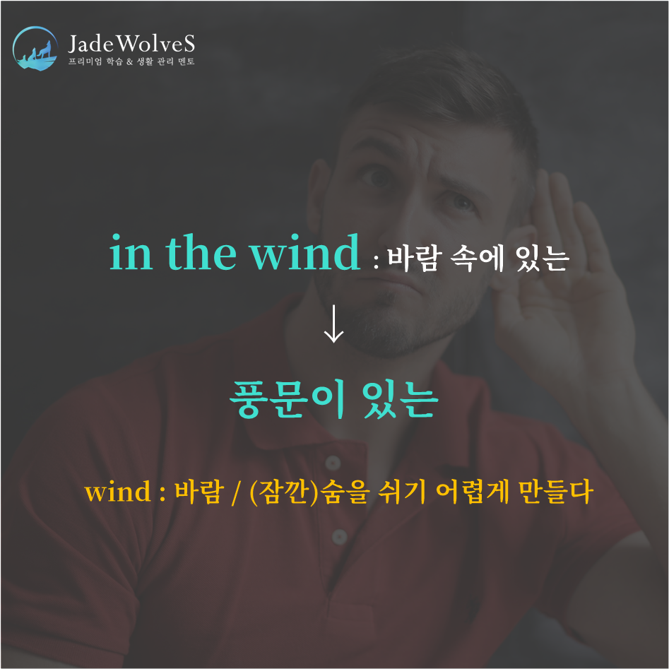 청랑 영어 식견/청랑 영어 단어 청랑의 영숙어 83 JWS 2023. 11. 22. 20:00 원어민들이 회화로 자주 사용하는 숙어에 대해 알아보겠습니다. 1) in the wind : "바람 속에 있는"이라고 해서 "풍문이 있는"이라는 의미로 사용됩니다.2) walk on air : "공중을 거다"라고 해서 "뛸 듯이 기쁘다"라는 의미로 사용됩니다.위 숙어를 이용해 여러분만의 문장을 하나씩 만들어 보세요!