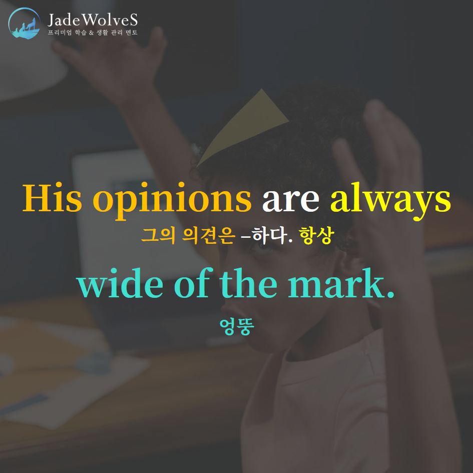 청랑 영어 식견/청랑 영어 단어 청랑의 영숙어 58 JWS 2023. 10. 3. 20:00 원어민들이 회화로 자주 사용하는 숙어에 대해 알아보겠습니다. 1) wide of the mark : "마크 지점이 넓은 - 핵심을 벗어난"이라고 해서 "엉뚱한"이라는 의미로 사용됩니다.2) sooner or later : "금방 또는 후에"라고 해서 "조만간"이라는 의미로 사용됩니다. 위 숙어를 이용해 여러분만의 문장을 하나씩 만들어 보세요!