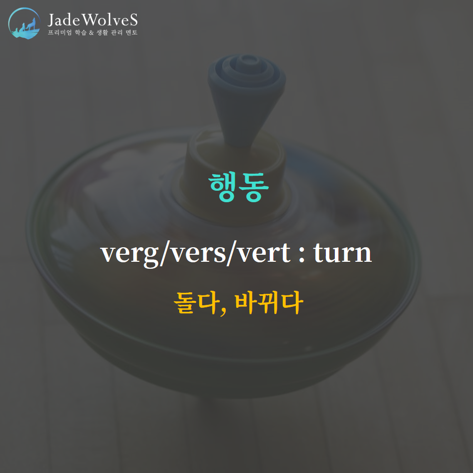 청랑 영어 식견/청랑 영어 단어 청랑의 어휘 끝장내기 : verg/vers/vert JWS 2024. 4. 18. 20:00 오늘은 verg/vers/vert 이라는 어원에 대해 알아보겠습니다. "verg/vers/vert : 돌다, 바뀌다"라는 의미로 행동을 나타냅니다.여러분이 알고 있는 단어 중 행동을 나타내는 verg/vers/vert 가 들어가는 단어는 무엇이 있나요?