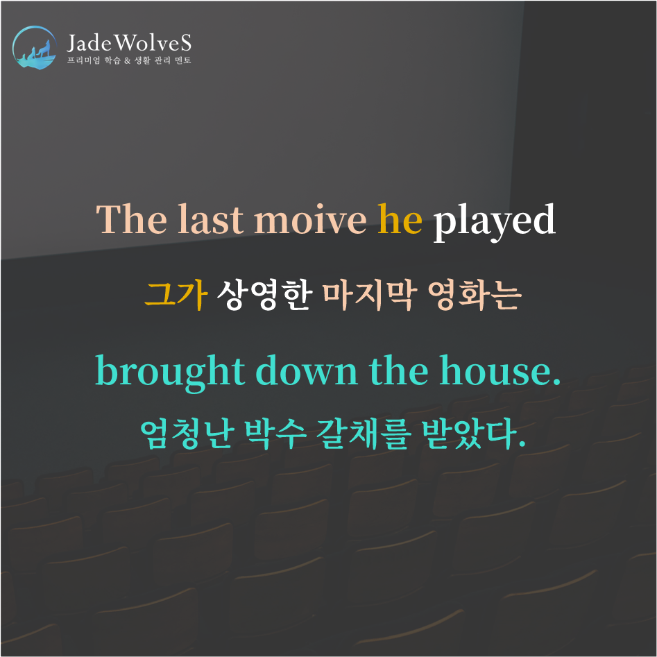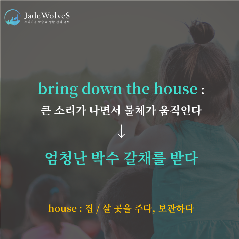 청랑 영어 식견/청랑 영어 단어 청랑의 영숙어 98 JWS 2023. 12. 22. 20:00 원어민들이 회화로 자주 사용하는 숙어에 대해 알아보겠습니다.1) bring down the house : "큰 소리가 나면서 물체가 움직인다"라고 해서 "엄청난 박수 갈채를 받다"라는 의미로 사용됩니다.2) fire off : "사라지게 하다"라고 해서 "빨리 보내다"라는 의미로 사용됩니다.위 숙어를 이용해 여러분만의 문장을 하나씩 만들어 보세요!
