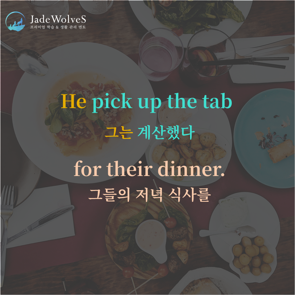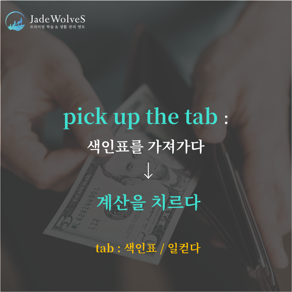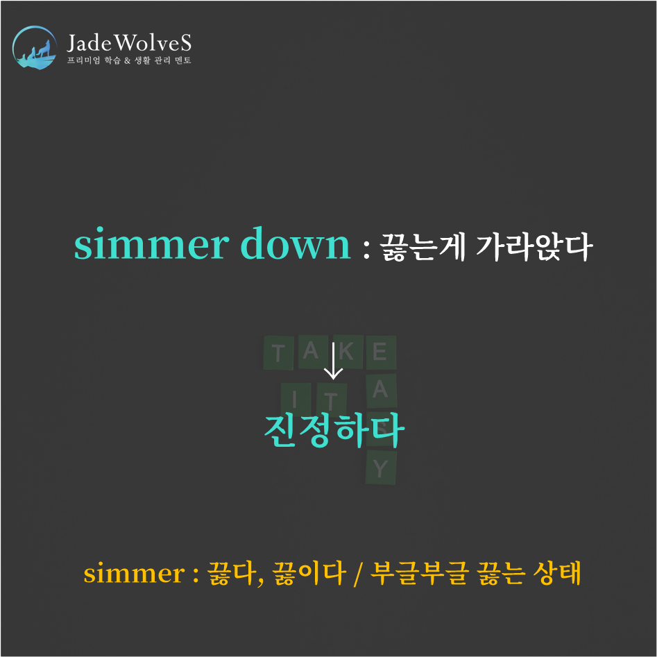 청랑 영어 식견/청랑 영어 단어 청랑의 영숙어 106 JWS 2024. 1. 7. 20:00 원어민들이 회화로 자주 사용하는 숙어에 대해 알아보겠습니다.1) simmer down : "끓는게 가라앉다"라고 해서 "진정하다"라는 의미로 사용됩니다.2) pick up the tab : "색인표를 가져가다"라고 해서 "계산을 치르다"라는 의미로 사용됩니다.위 숙어를 이용해 여러분만의 문장을 하나씩 만들어 보세요!