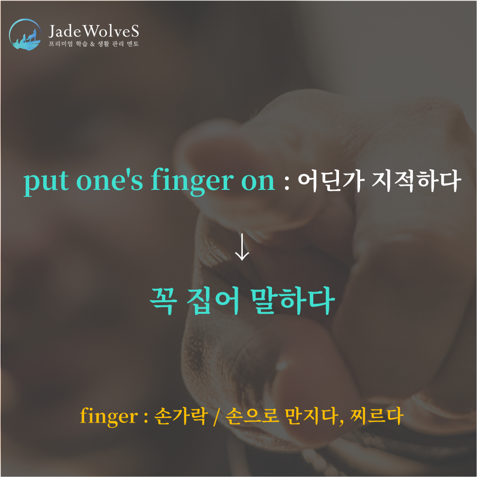 청랑 영어 식견/청랑 영어 단어 청랑의 영숙어 88 JWS 2023. 12. 2. 20:00 원어민들이 회화로 자주 사용하는 숙어에 대해 알아보겠습니다. 1) put one's finger on : "어딘가 지적하다"라고 해서 "꼭 집어 말하다"라는 의미로 사용됩니다.2) give the green light : "긍정적 신호를 주다"라고 해서 "허락하다"라는 의미로 사용됩니다.위 숙어를 이용해 여러분만의 문장을 하나씩 만들어 보세요!
