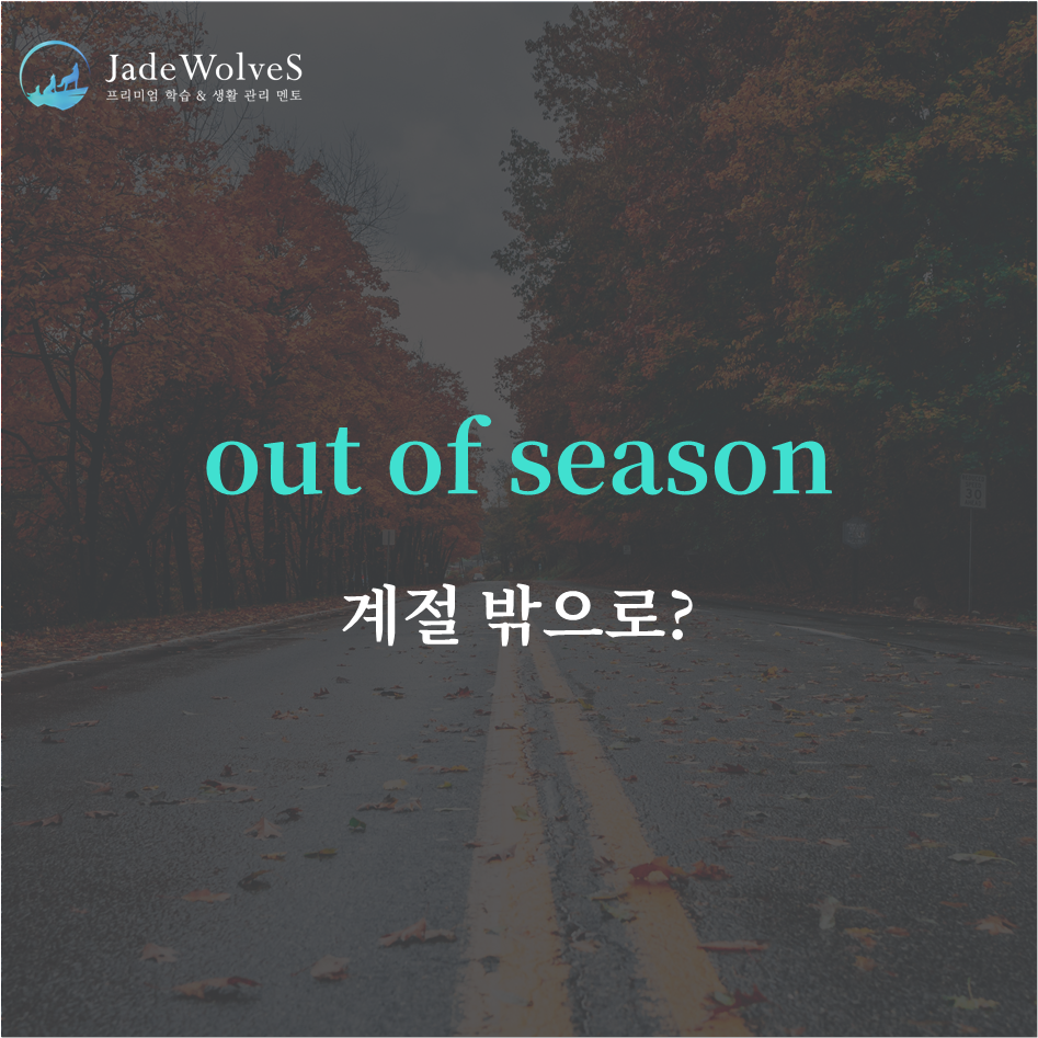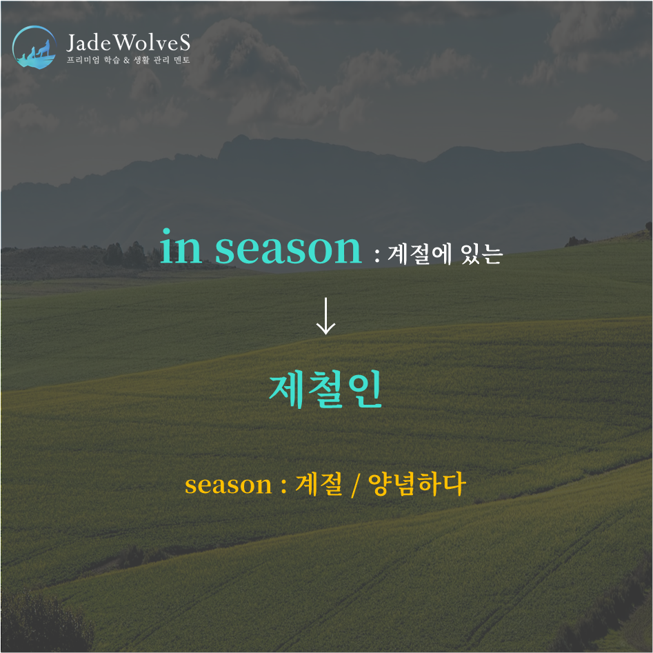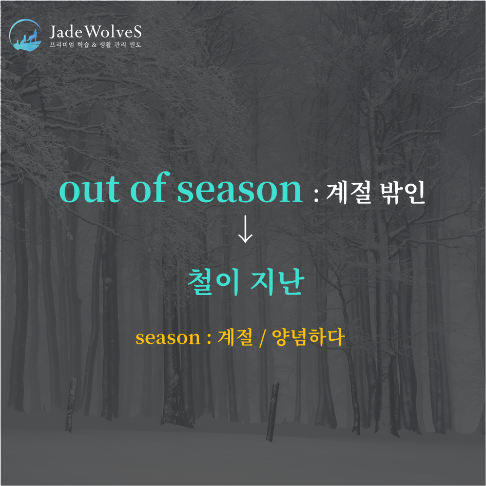청랑 영어 식견/청랑 영어 단어 청랑의 영숙어 81 JWS 2023. 11. 18. 20:00 원어민들이 회화로 자주 사용하는 숙어에 대해 알아보겠습니다. 1) in season : "계절에 있는"이라고 해서 "제철인"이라는 의미로 사용됩니다.2) out fo season : "계절 밖인"이라고 해서 "철이 지난"이라는 의미로 사용됩니다.위 숙어를 이용해 여러분만의 문장을 하나씩 만들어 보세요!
