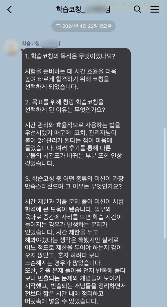 시험을 준비하는 데 시간 효율을 더욱 높여 빠르게 합격하기 위해 코칭을 선택하게 되었습니다.