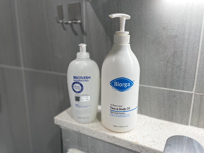 3. 튼살 방지 크림이나 오일을 아침저녁으로 바른다. 저녁에는 아침보다 유분이 많은 제품을 바르는 게 효과적이다. 아침 출근을 위해 샤워 후 물기를 닦자마자 튼살 크림 2번, 오일 1번을 섞어서 충분히 발라주어 피부가 건조하지 않게 만들어 주었다. 여기서 가장 중요한 건 내 몸 구석구석 빠지지 않고 발라줘야 튼살이 생기지 않는다. 나의 경우 시력이 좋지 않아 샤워할 때는 안경을 벗고 있기 때문에 튀어나온 배만 바르면 된다고 생각했는데, 엉덩이와 허벅지 안쪽에 살이 튼걸 태교 여행으로 제주도에 갔던 숙소 전신거울을 보다 나중에 발견했다. 우리 집 화장실 거울 높이가 높은 편이라 상반신만 보이고 하반신을 보려면 안경을 끼거나 렌즈를 끼고 봐야 했는데, 모르고 배만 열심히 발랐다.