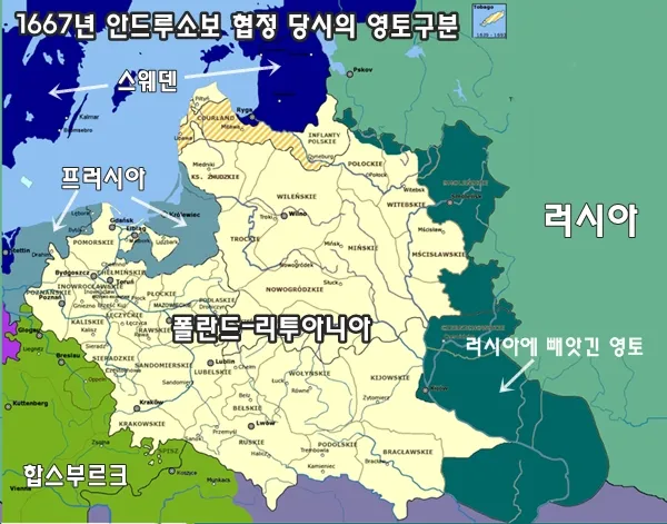폴란드-리투아니아 제국은 16세기부터 17세기까지 유럽에서 가장 큰 영토와 많은 인구를 가진 국가였습니다. 리투아니아는 강성해지고 있는 러시아 차르국에 맞서 폴란드 군사력이 필요했습니다. 양국은 하나의 왕이 통치하되 귀족들로 구성된 입법부인 군주를 선출하는 방식을 선택합니다. 선출된 군주의 왕권은 법과 의회에 의해 일부 제외되었습니다. 당시로서는 매우 특이한 부분이었으나 현대판 미국 연방제와 비슷한 형태를 가지고 있습니다. 두 국가는 유럽에서 발생한 30년 종교 전쟁에 참전하지 않으며, 국력을 아껴 현재의 우크라이나 일대와 러시아 모스크바까지 점령하였습니다. 그러나 북쪽으로는 스웨덴이 동쪽에는 러시아, 남서쪽에서는 함스부르크 제국과 싸우며 국력을 소모하였고 제국은 분해되었습니다. 결국 폴란드와 리투아니아는 과거에 비해 많은 영토를 잃게 되었습니다.