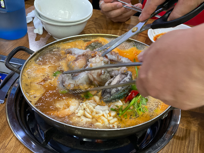 [칸맘 멘트] 회, 해산물, 초밥 등 바다에서 나는 음식에 환장하는 칸맘은 일주일에 1회 이상 먹는 편이다. 네이버에 부산 해물탕 맛집으로 검색하면 항상 검색 결과에 떴지만 한 번도 방문한 적 없었던 곳 중 하나! 칸맘 생일날 비도 추적추적 내리고 집밥을 차려 먹기 귀찮던 날 반신반의로 방문했던 부산 송도 사천해물탕 맛집! 분명 뜨겁지만 시원한(?) 국물 한 입을 먹자마자 왜 인제야 방문했을까? 라는 생각뿐! 사천해물탕이지만 적절한 간에 생각보다 맵지 않아 밥 한 그릇 뚝딱이다. 신선한 해산물까지 곁들여서일까 너~무 맛있다!!