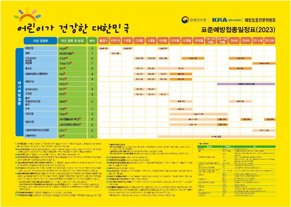 예방접종은 감염병으로부터 아이를 보호할 수 있는 효과적인 방법임으로, 표준 예방접종 일정에 따라 접종하길 권장한다.