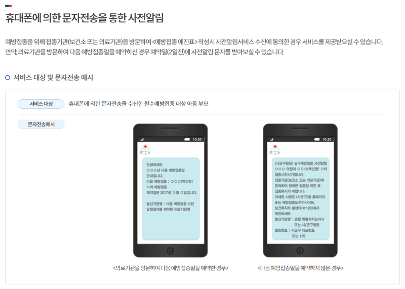 필수예방접종 대상 아동 부모가 아이의 예방접종을 지연하거나 누락하지 않고 접종할 수 있도록 다음 필수예방접종 접종 시기를 사전에 알리는 서비스이다. 휴대폰 문자전송을 통해 사전 알림을 받자!
