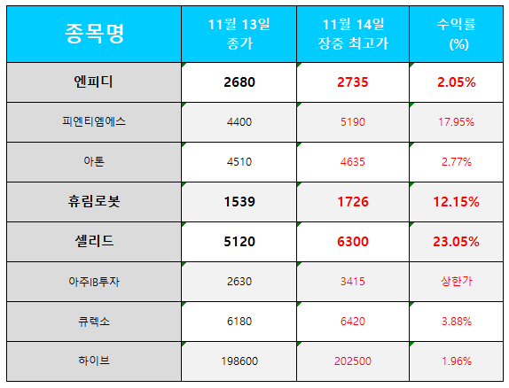 오늘의 관심 종목 수익률(2024.11.14)