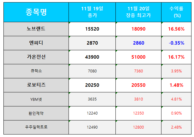 오늘의 관심 종목 수익률(2024.11.20)