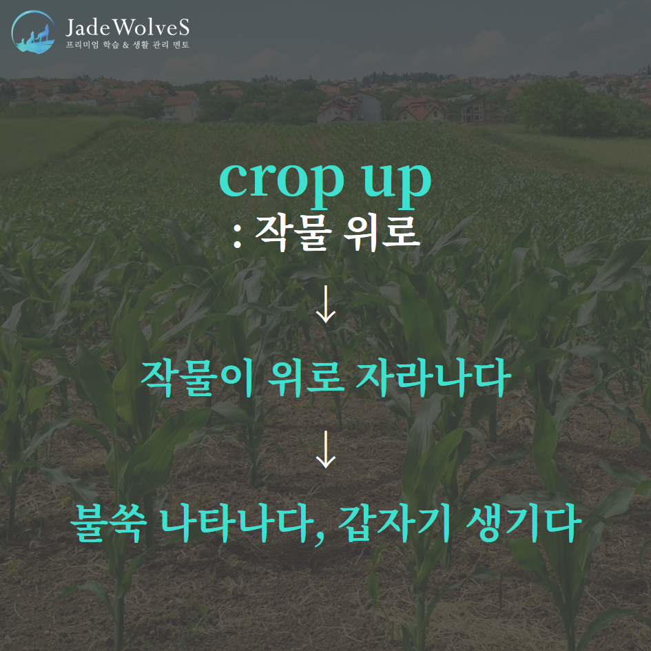 1) crop up : "작물이 위로 자라다"라고 해서 "불쑥 나타나다, 갑자기 생기다"라는 의미로 사용됩니다.