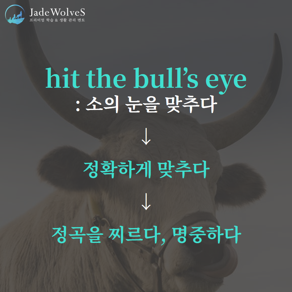 2) hit the bull's eye : "소의 눈을 정확하게 맞추다"라고 해서 "정곡을 찌르다, 명중하다"라는 의미로 사용됩니다.
