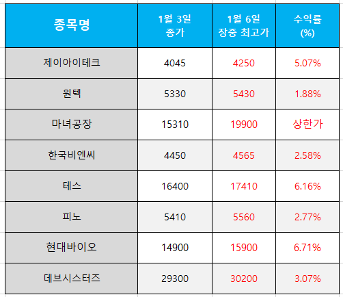 오늘의 관심 종목 수익률(2025.01.06)