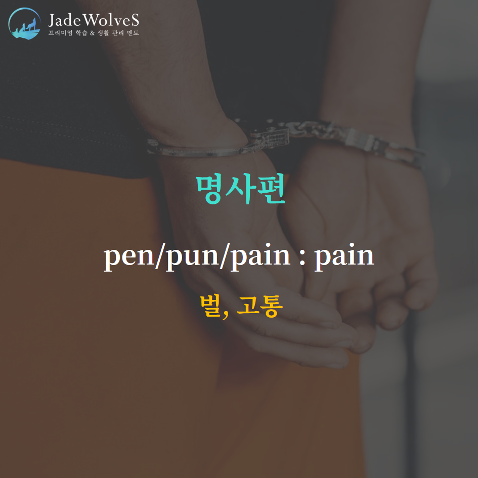 " pen/pun/pain - :pain"라는 어원으로 "벌, 고통"라는 뜻의 명사를 나타냅니다.