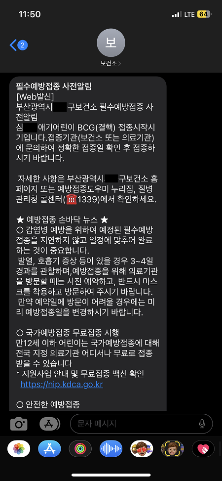 피내용 : 무료(흉터 있음), 경피용 : 유료(약 5~10만 원, 흉터 거의 없음). 보건소 사전 알림 문자는 아래와 같다.