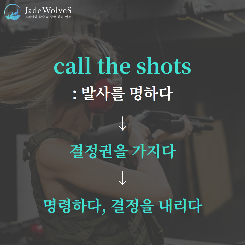 1) call the shots : "발사를 명하다"라고 해서 "명령하다, 결정을 내리다"라는 의미로 사용됩니다.