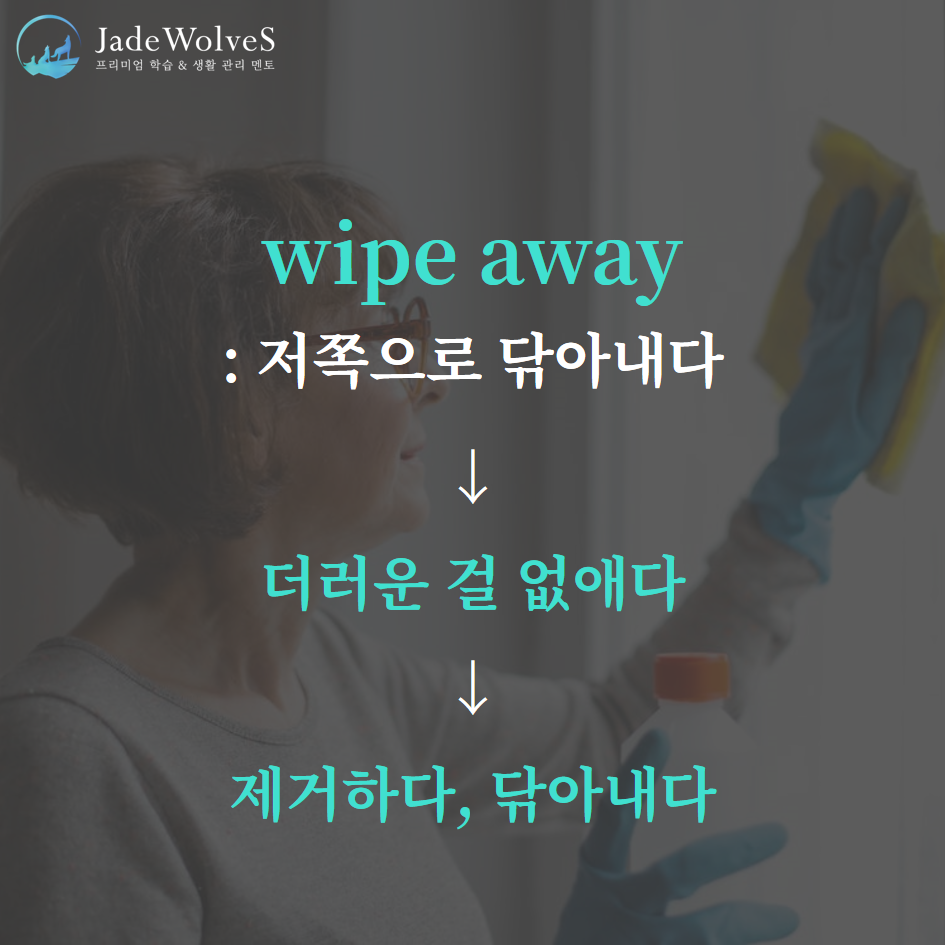 2) wipe away : "저쪽으로 닦아내다"라고 해서 "제거하다, 닦아내다"라는 의미로 사용됩니다.