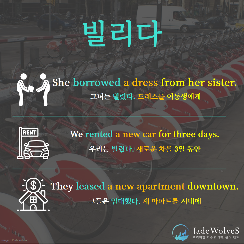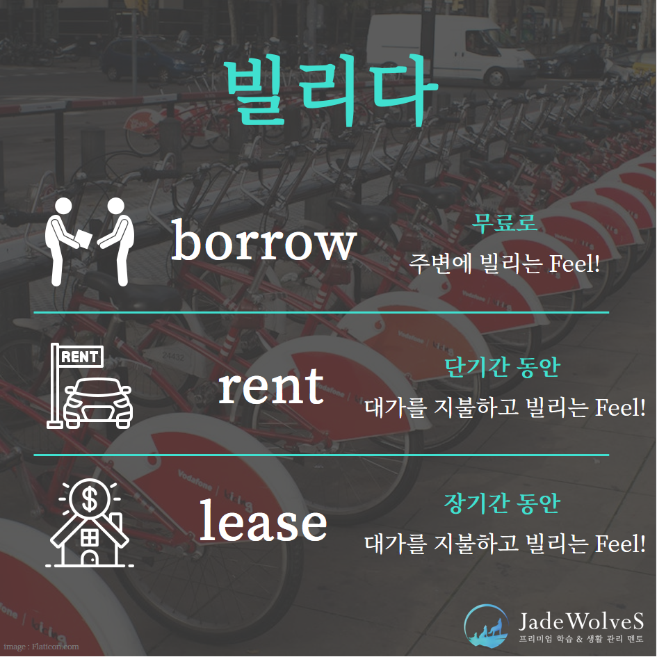 청랑 영어 식견/청랑 영어 단어 청랑의 보카 뉘앙스 : borrow/rent/lease JWS 2024. 6. 24. 20:00 오늘은 '빌리다'라는 뜻의 뉘앙스에 대해 알아보겠습니다. "borrow/rent/lease는 빌리다"라는 의미가 있지만 미묘한 차이가 있습니다.위 단어를 이용해 문장을 하나씩 만들어 보세요!