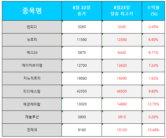 오늘의 관심 종목 수익률(2024.08.23)