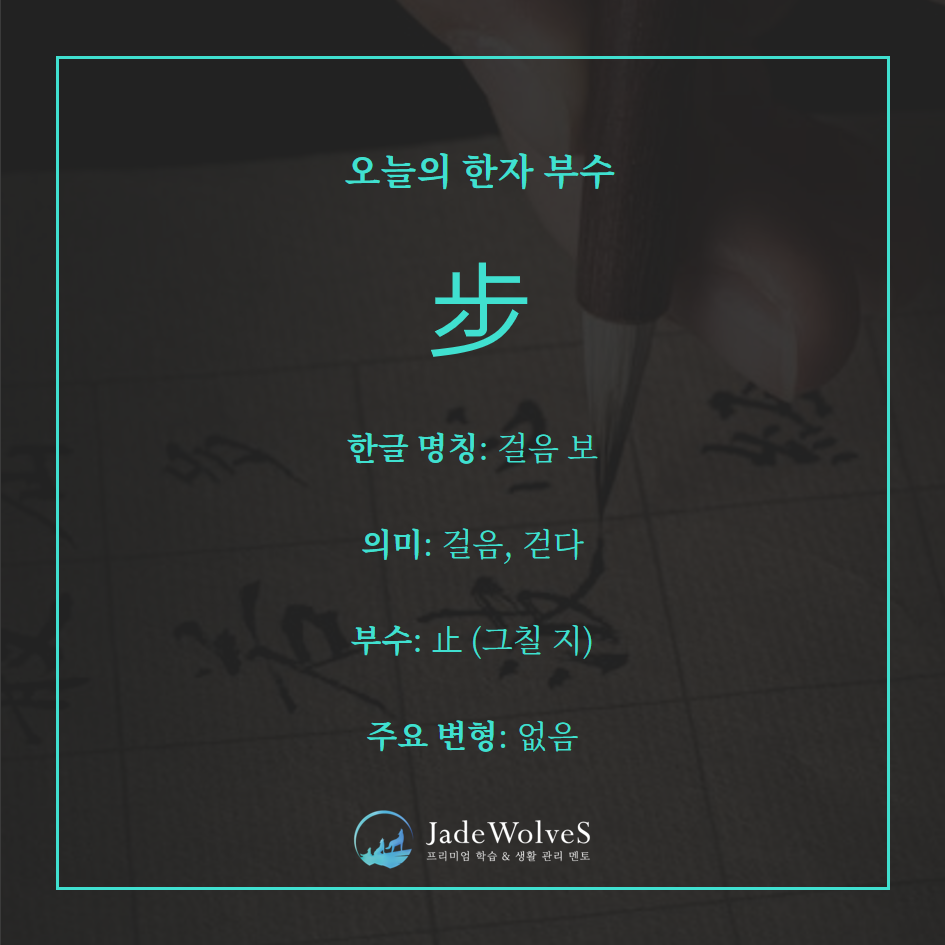 止(지·발/멈추다)에서 발전한 글자로, 발걸음이 나아가는 모습을 나타내 ‘걸음, 보행’의 뜻이 됩니다.