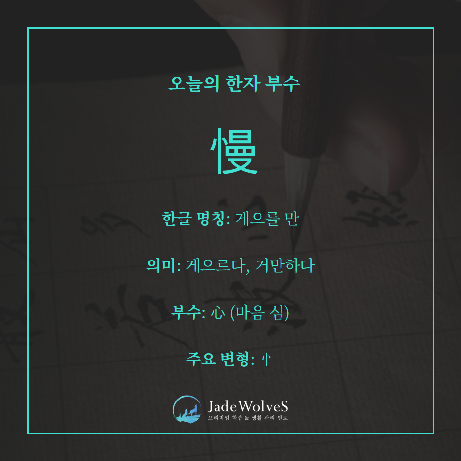 忄(심·마음/뜻부) + 曼(만·길다/음부). 마음이 느슨하고 풀어진 데서 ‘느리다, 게으르다’, 나아가 ‘거만하다’의 뜻이 생겼습니다.