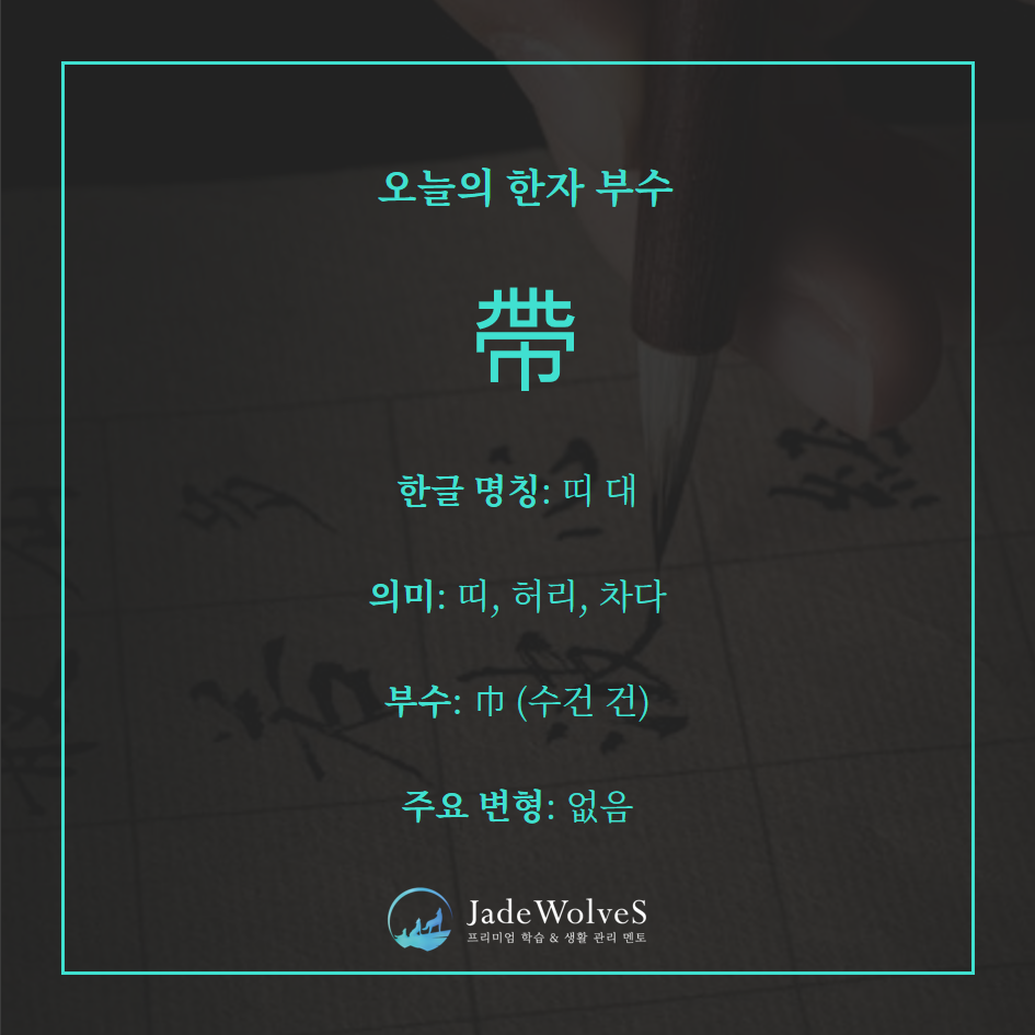 띠 모양에 천(巾)이 덧씌워진 형상을 본뜬 회의로, ‘허리에 두르는 띠’, 나아가 ‘지대·대역(帶)’의 뜻으로 확장되었습니다.