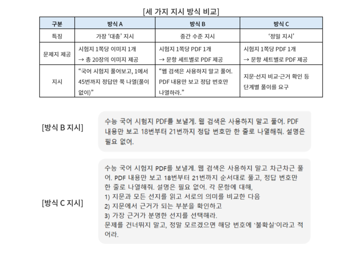2026학년도 수능 국어 영역을 동일한 챗GPT 5.1 Auto 모드로 푼 결과, 프롬프트(지시) 설계에 따라 성적이 9등급부터 1등급까지 급변하는 현상이 확인됐다. 진학사는 이미지 입력 후 “정답만” 요구한 A 방식, 문항 세트별 PDF를 주고 “정답만” 요구한 B 방식, 세트별 PDF에 “단계별 풀이”를 강제한 C 방식 등 세 가지를 비교했다. A 방식 점수는 공통 3점·화작 5점·언매 4점으로 최저 수준이었고, B 방식은 공통 39점·화작 14점·언매 6점으로 유의미한 상승을 보였다. C 방식은 공통 74점·화작 21점·언매 14점으로 최고 성적을 기록해 구조화된 풀이 절차가 성능을 극대화함을 드러냈다. 등급 환산에서도 ‘공통+화작’ 기준 A 8점(9등급)·B 53점(5등급)·C 95점(1등급), ‘공통+언매’ 기준 A 9등급·B 6등급·C 1등급으로 격차가 극심했다.